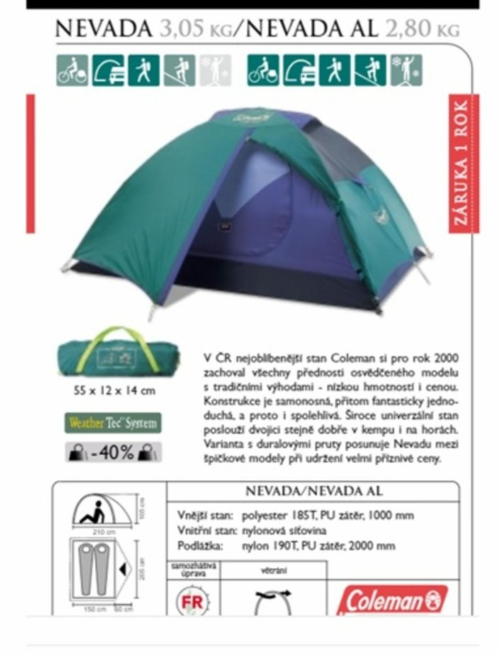 Stan pro 2 osoby Coleman NEVADA AL vč. přepravní tašky. Samonosný, typ kopule, velice snadné a rychlé postavení, lehká a odolná duralová konstrukce (nikoli sklolaminát, neláme se), hmotnost 2,9 kg, výška 105 cm, rozměr 150 (+60) x 210 cm, barva zelená/modrá, odlehčená podlážka. Vodní sloupec: podlážka 3000 mm, tropiko 2000 mm. Přelepené švy, překryté zipy, vrchní větrání. Vhodný pro cykloturistiku, turistiku, na festival. Stan je v perfektním stavu. (jako nový). Vhodný dárek.