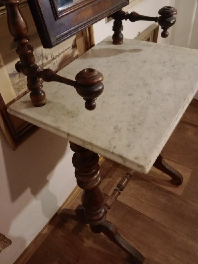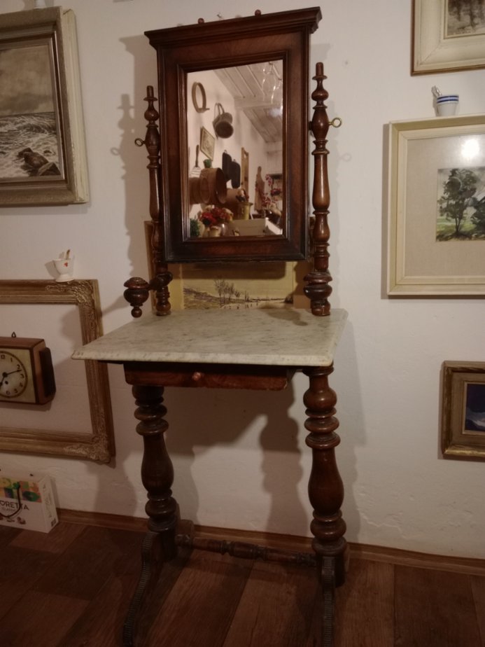 Starožitnou toaletku, dřevo tmavé, deska matný mramor, zrcadlo čisté, nepoškozené. Cena 5.000 Kč. Při rychlém jednání sleva.