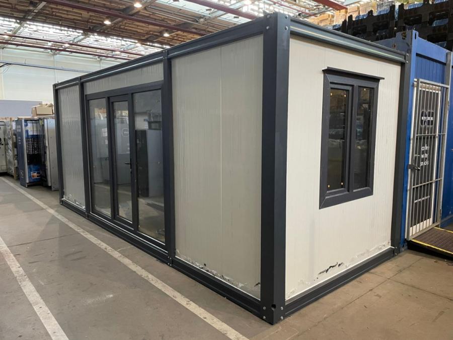 Nabízím stavební buňku bílá + antracit 6x2,4m - smontovaná - s francouzskými okny a dveřmi, elektroinstalace, podlaha vinyl. Super cena. 115.000 Kč.