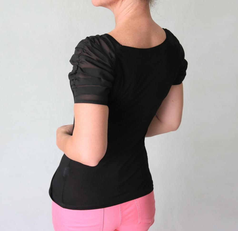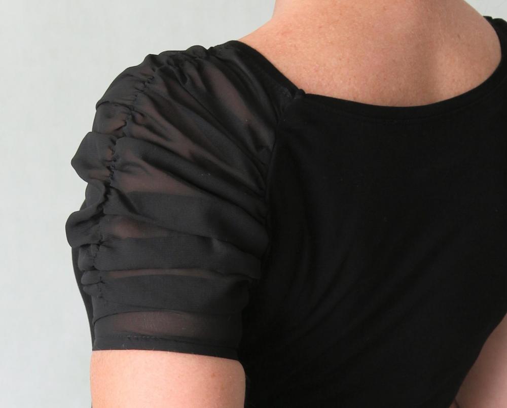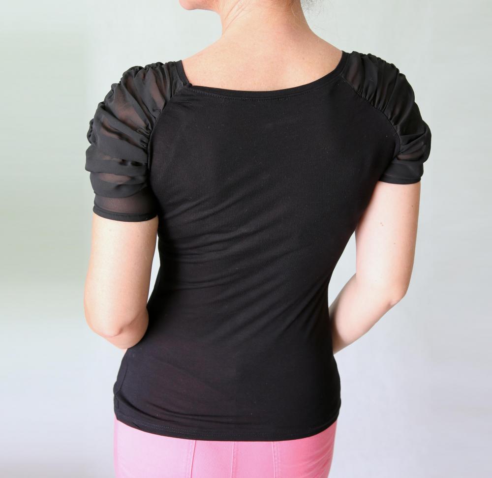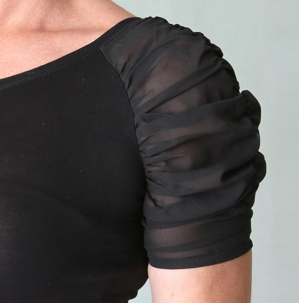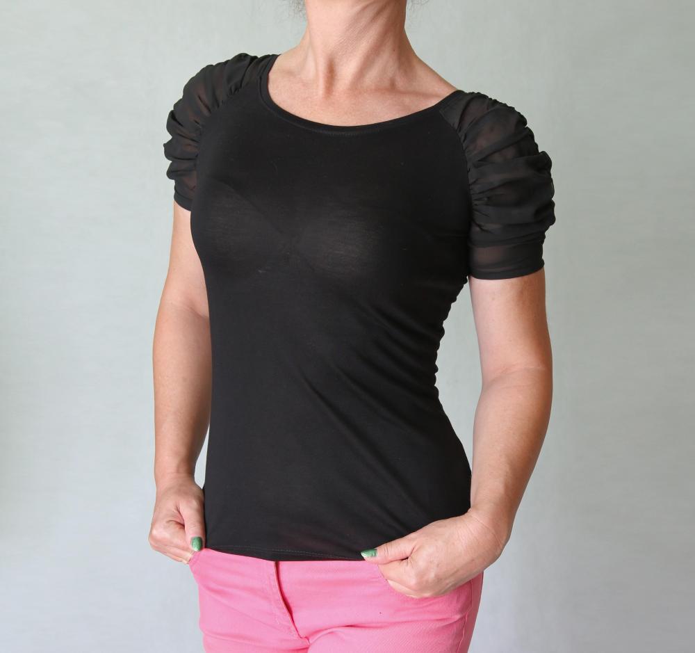 Příjemné tričko s průsvitnými šifónovými řasenými rukávky zn. Atmosphere. Velikost S, rozměry bez natažení: prsa 78 cm, pas 68 cm, boky 88 cm, délka 58 cm.