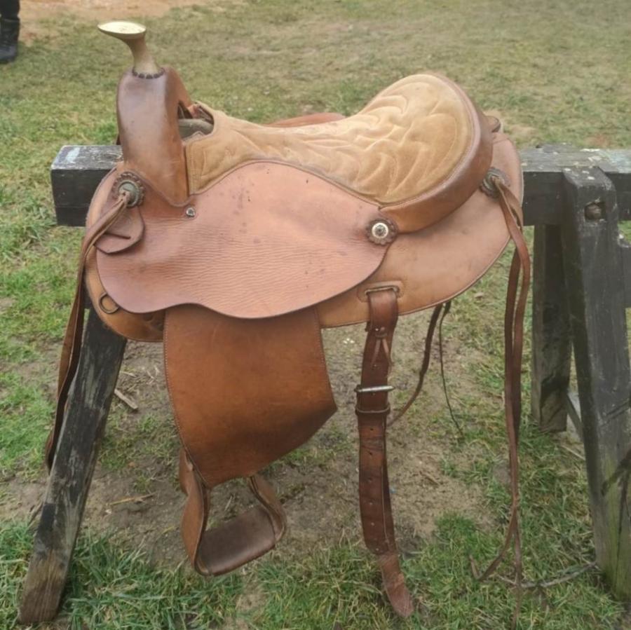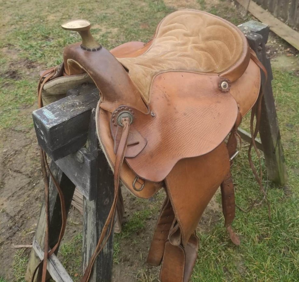 Celokožené sedlo s mosaznými doplňky. Ruční práce. Bylo na Haflinga. 13.000 Kč.