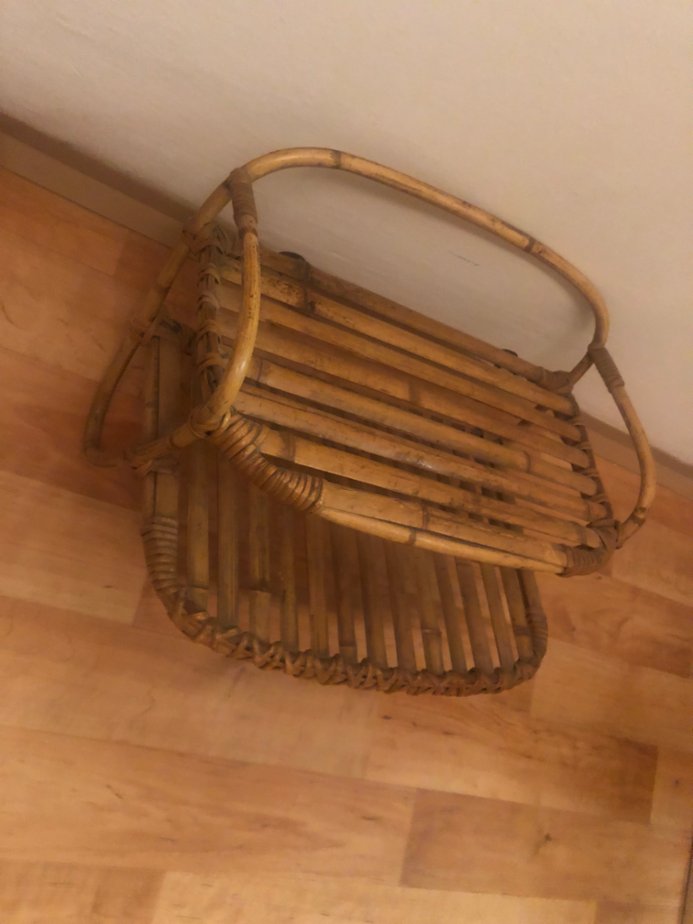 Zachovalou bambusovou poličku na telefon a "telefonní seznam". Rozměry (ŠxV) 40x33cm; hloubka vrchní poličky 25cm, spodní 29cm. Na 2 háčky (rozteč 24cm). Cena dohodou.