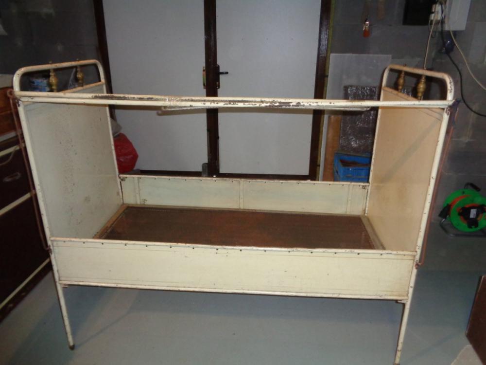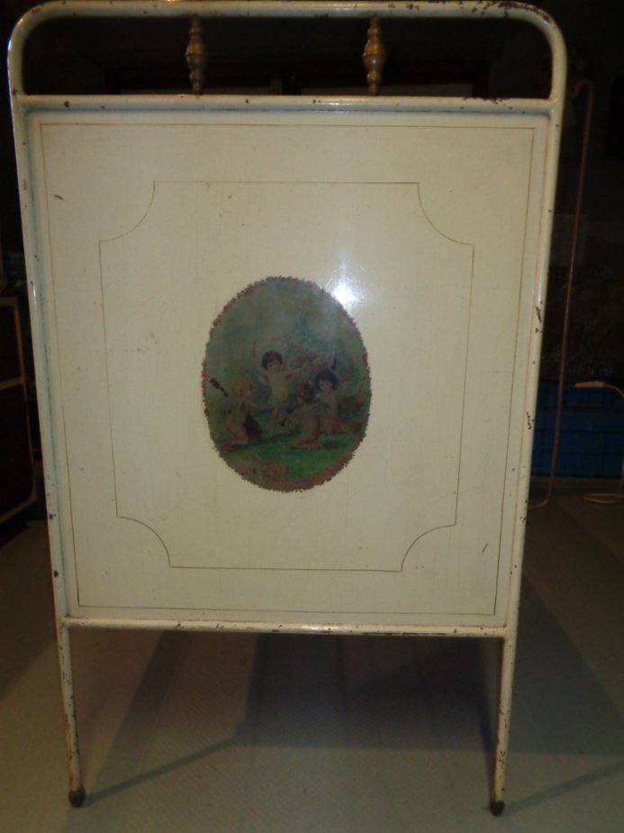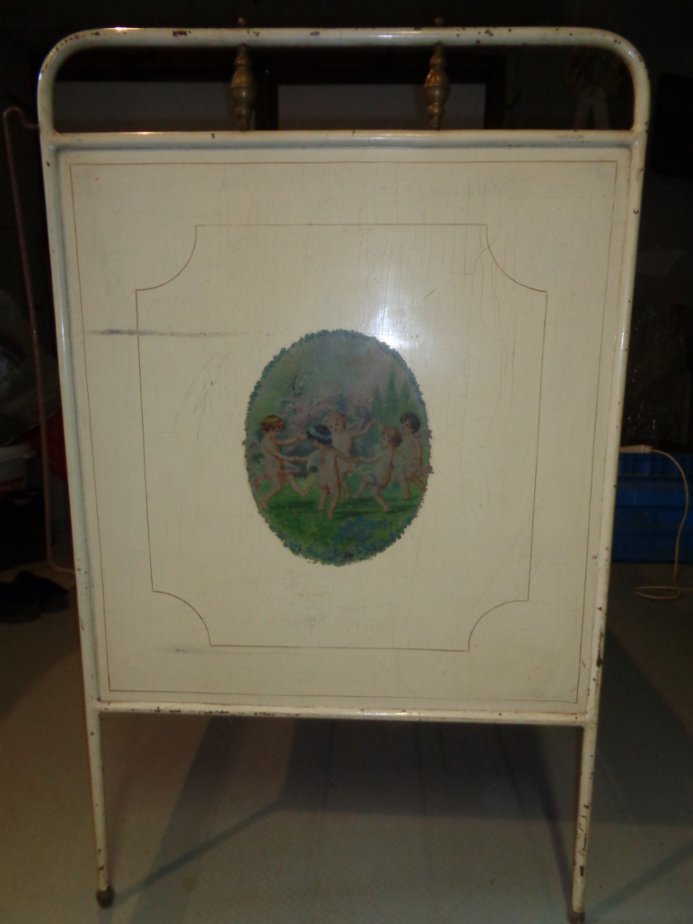 Železná dětská postýlka s andělíčky z 1. pol. min. stol., bez matrace a bočních výpletů. K renovaci. D 142, š 71, v 120 cm. Je pečlivě zabalená k přepravě, váha 37 kg, d 145, š 76, v 15 cm. Vzhledem k váze a rozměrům nejlépe osobní převzetí. 500 Kč.