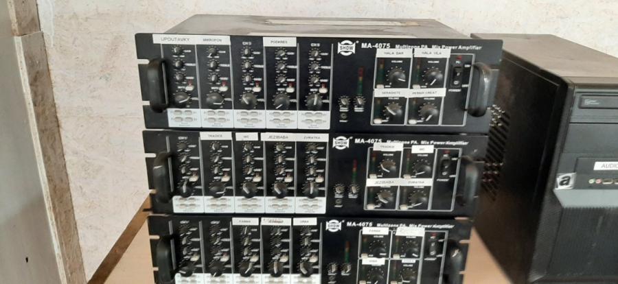 Monozesilovač MA 4075 - ento multi-zónový koncový zesilovač je vhodný pro bary, puby a restaurace. Prodávám 2 kusy. Jeden za 5.000 Kč, nebo dva za 8.000 Kč. Výkon: 4x 50W. Provedení: 25V/70V/100V/4-8 Ohm . Frekvenční rozsah: 50Hz - 16kHz. Rozměry: 483x132x310 mm.