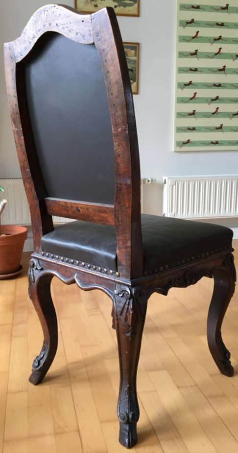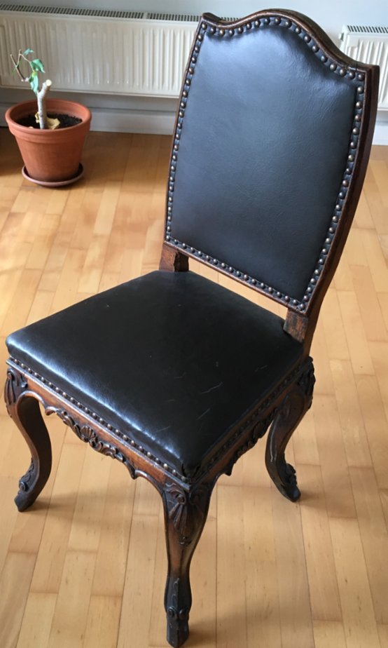 Starožitná židle v kůži (nově), pevná a velmi pohodlná, velmi dobrý stav - 2 kusy. Cena 6.750 Kč/kus, resp. za oba kusy celkem 12.790 Kč.