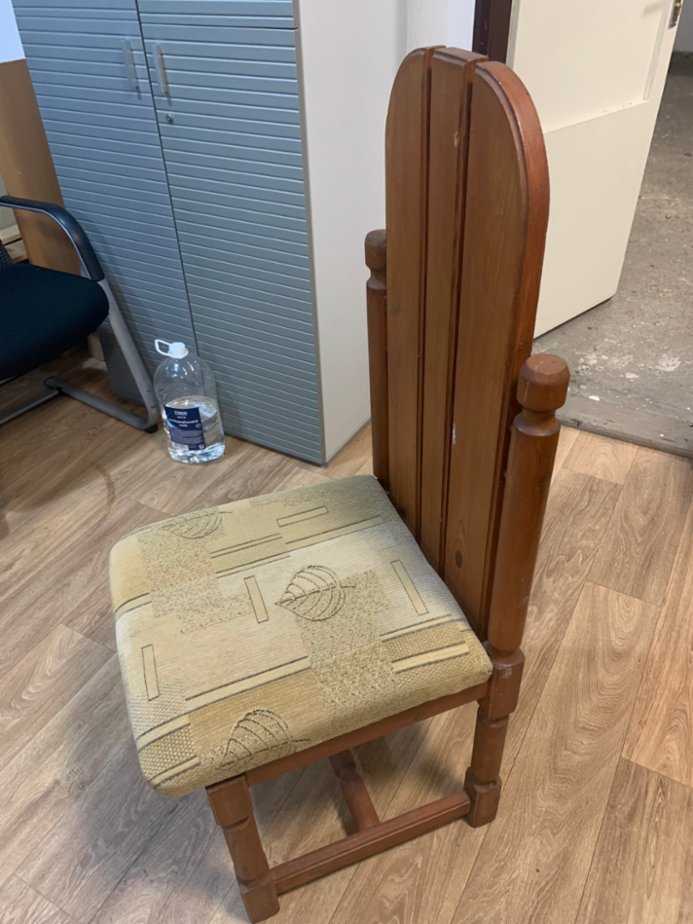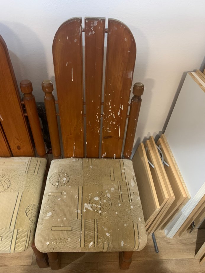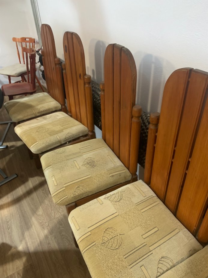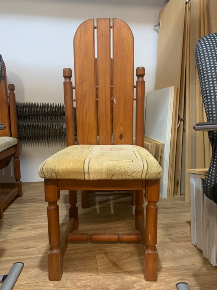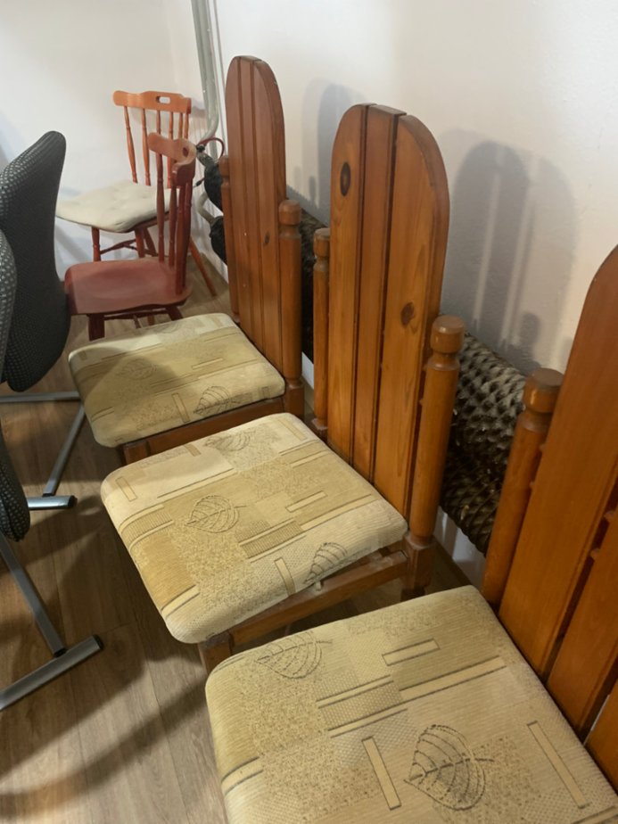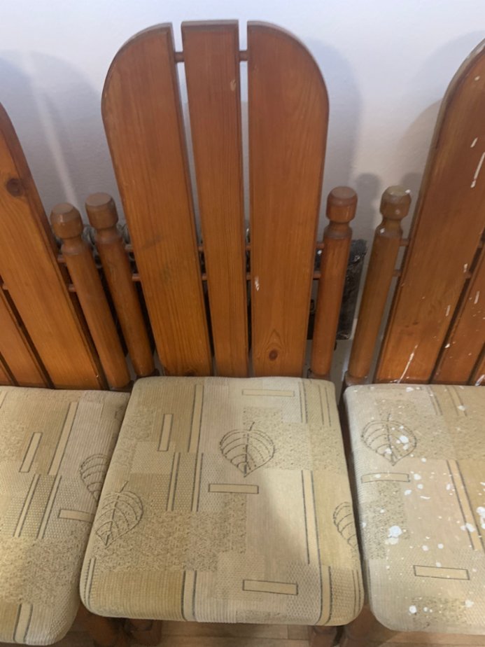 Židle 6 kusů, jedna od barvy, druhá mírně, velmi dobrý materiál ze dřeva, židle jsou pevné a bytelné, bude potřebovat jednu židli od barvy vyčistit a potah na sedátku přečalounit, cena za komplet 6 kusů židlí, jinak jsou v pořádku. výška sezení 48 cm , sedátko 45x45 cm , výška s opěradlem 113 cm. 600 Kč.